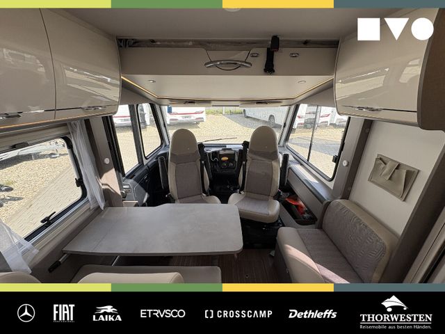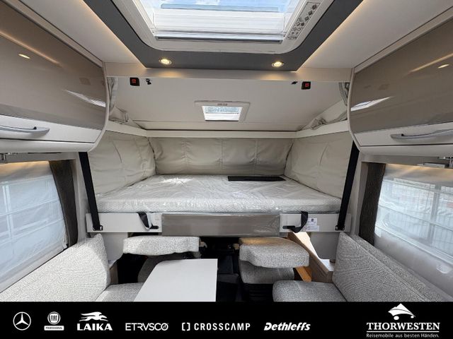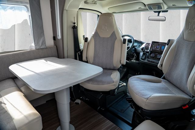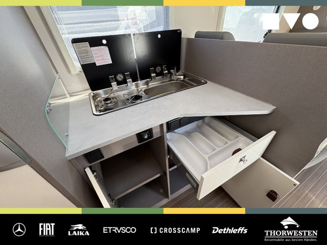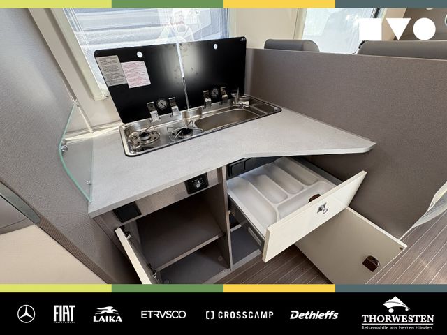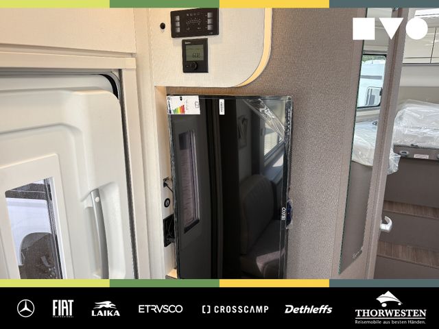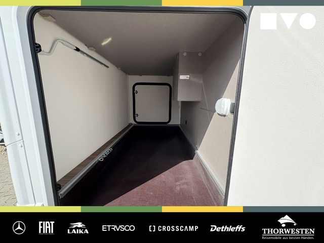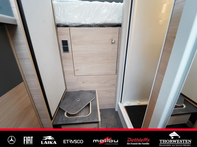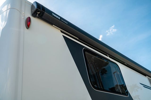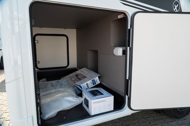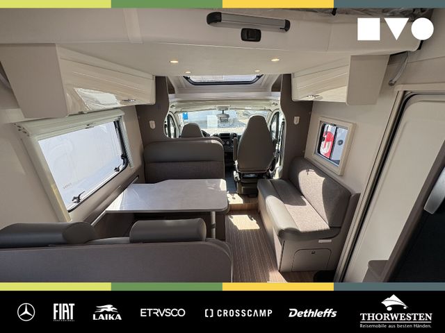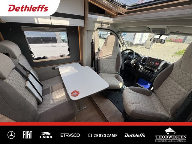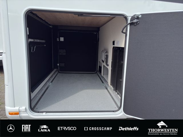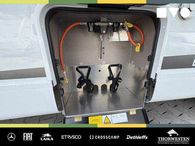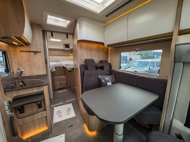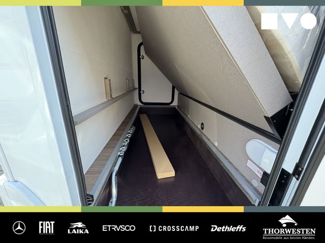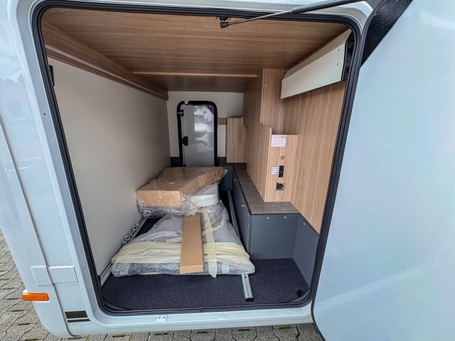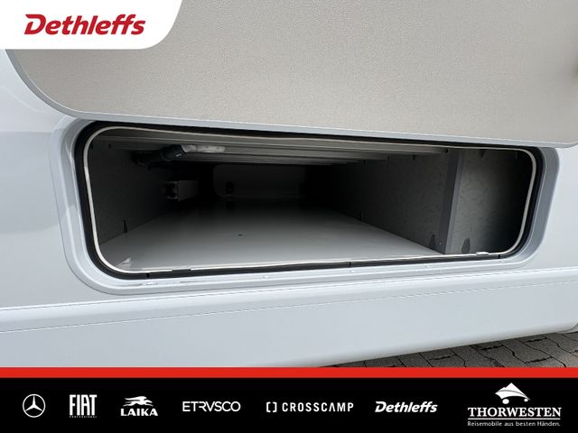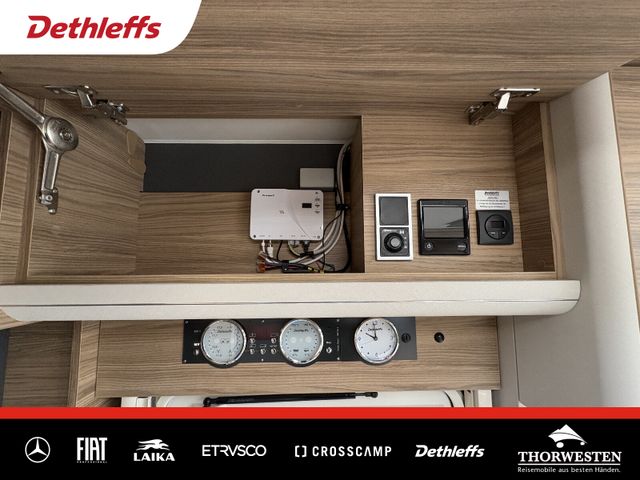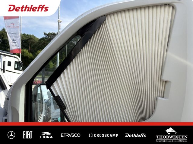 Travel-Paket (Vorbereitung für Radiosystem inkl. Soundpaket im Fahrerhaus, Radioantenne DAB+ auf dem Dach montiert, Panorama-Dachhaube 75x105 cm im Wohnraum, Light Moments: Indirekte Ambientebeleuchtung über den Dachstauschränken, Stützen (2 Stk.) für Anbau hinten, Elektrischer Frontscheiben-Rollo, Automatische Gasflaschenumschaltung inkl. Crash Sensor, EisEx und Gasfilter, Dunstabzugshaube (Abluft) mit Zugluft-Stopper, Integrierte Einlinsen Rückfahrkamera, Zentralverriegelung für Fahrerhaus-, Wohnraumtüre und Garagentüren)