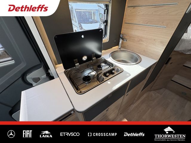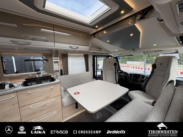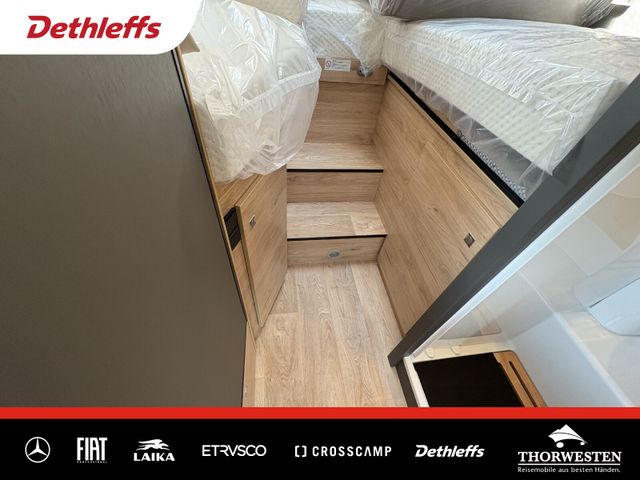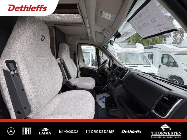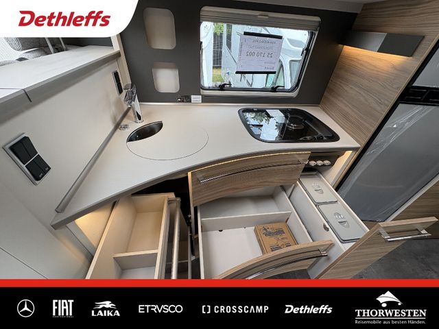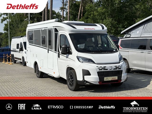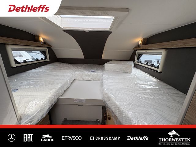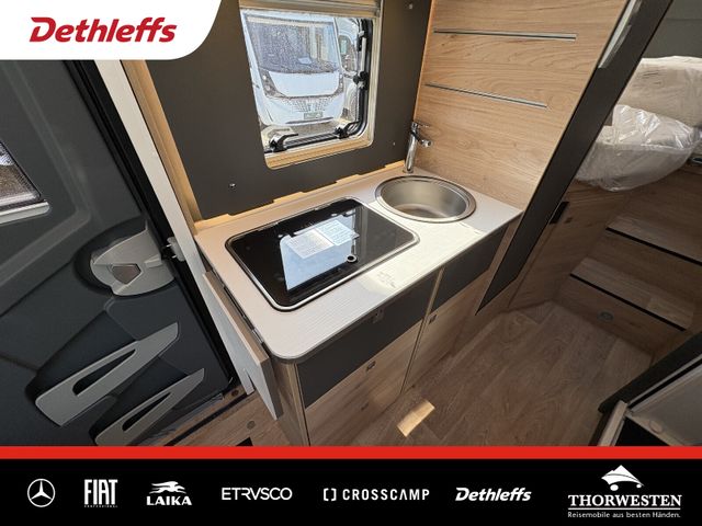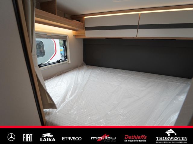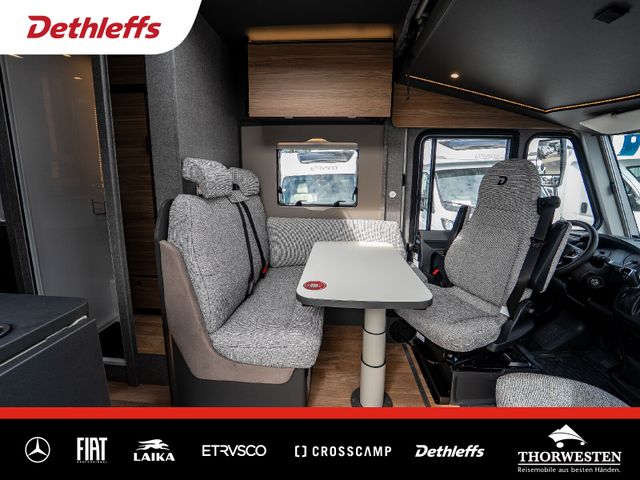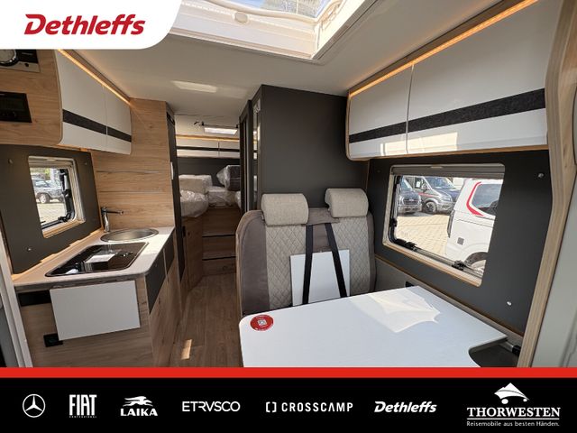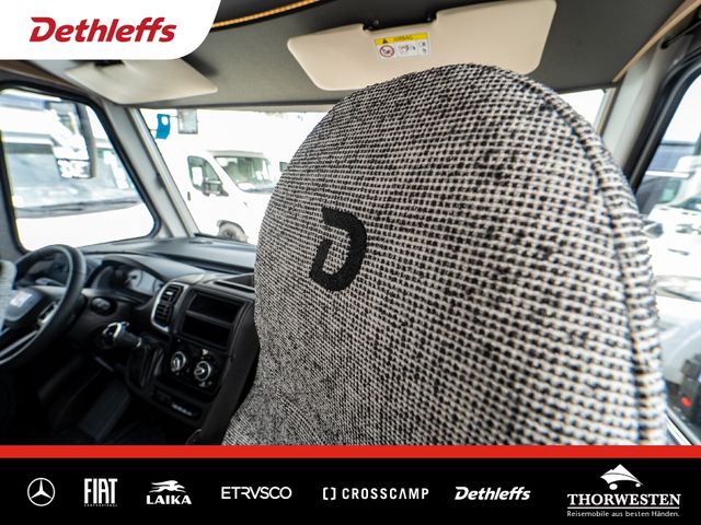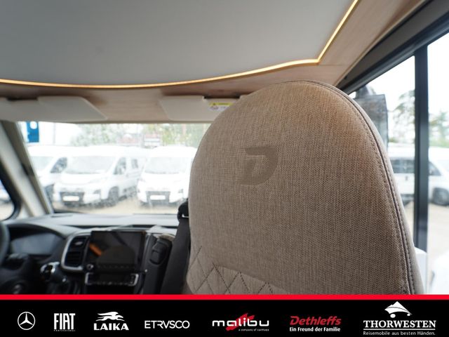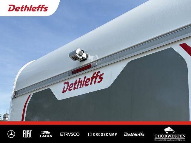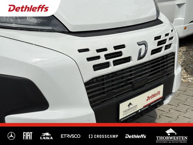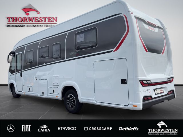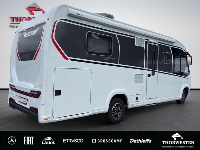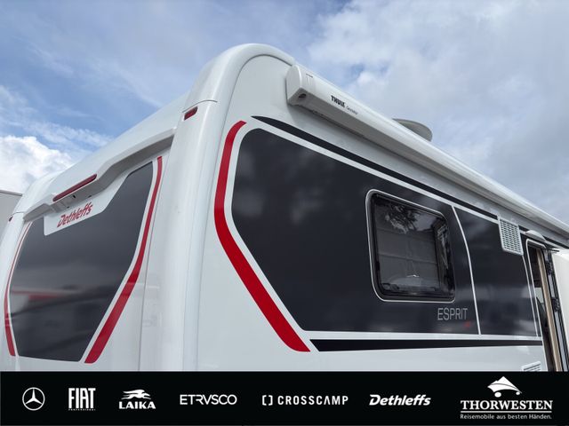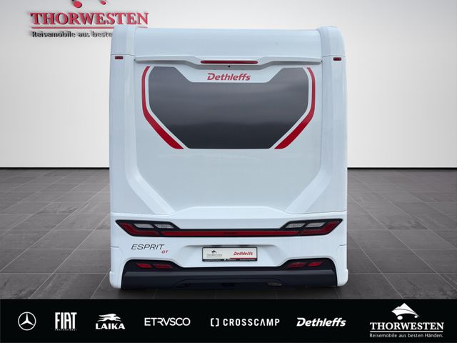 Esprit GT Paket (LED-Abblendlicht, Sonnenblenden seitlich, als Rollo für Fahrer und Beifahrer, Panorama-Dachhaube 70 x 50 cm im Schlafraum, Innendesign GT inkl. erweiterter Küchenrückwand, Außendesign GT Advance (Heckleuchtenträger mit schwarzem Diffusor, lackierung I-Front teilweise schwarz, Kühlergrill mit Chromkeder, Skidplate "rot"), Hoher charakteristischer Dethleffs Exklusiv Heckleuchtenträger mit ShapeLine LED Rückleuchten, in Heckspoiler integrierter 3. Bremsleuchte und eingezogener Heckwand)