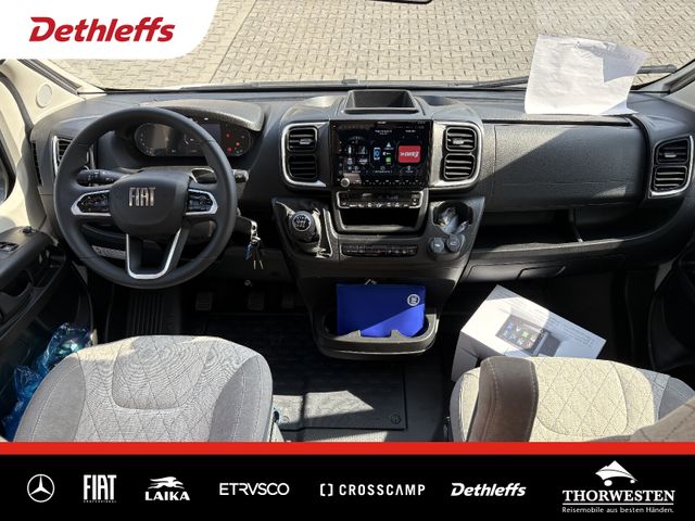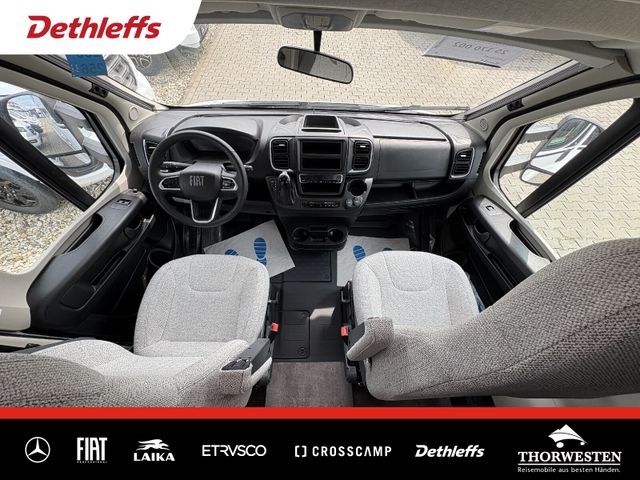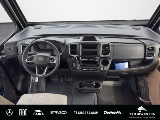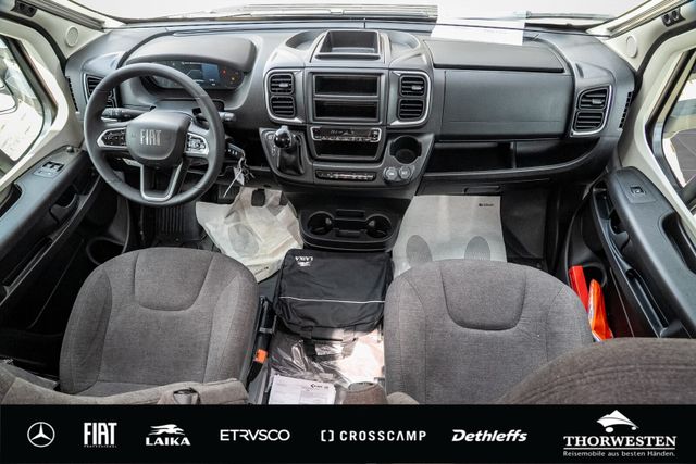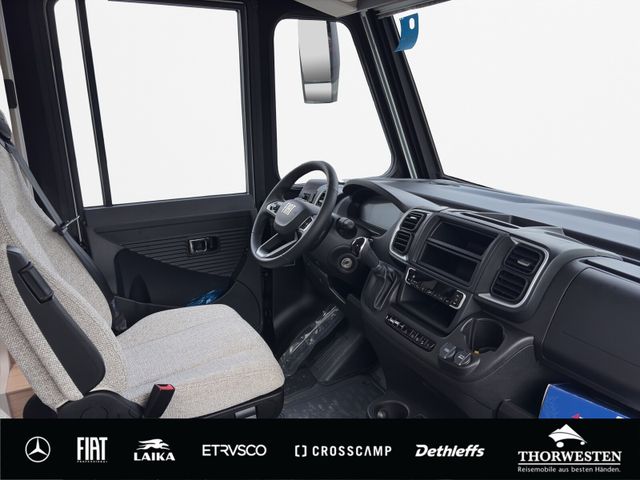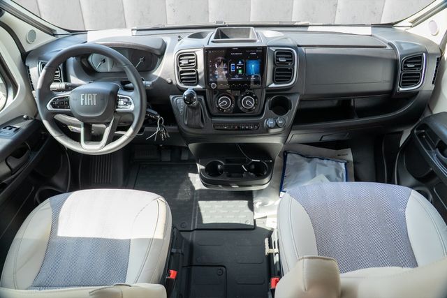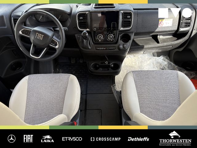Fiat-Paket (Klimaanlage Fahrerhaus Fiat, manuell, Außenspiegel elektrisch verstell- und beheizbar, Airbag Beifahrer, Tempomat, Cruise Control, Fahrerhaussitze drehbar, Original Fiat-Captainchair-Sitze mit Armlehnen, Höhenverstellung Beifahrersitz, Bereifung 16" statt 15", Sitzkasten-Verkleidungen, Lenkrad mit Bedienelementen für Radio)