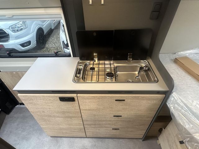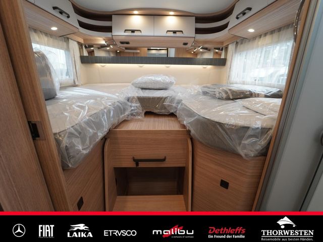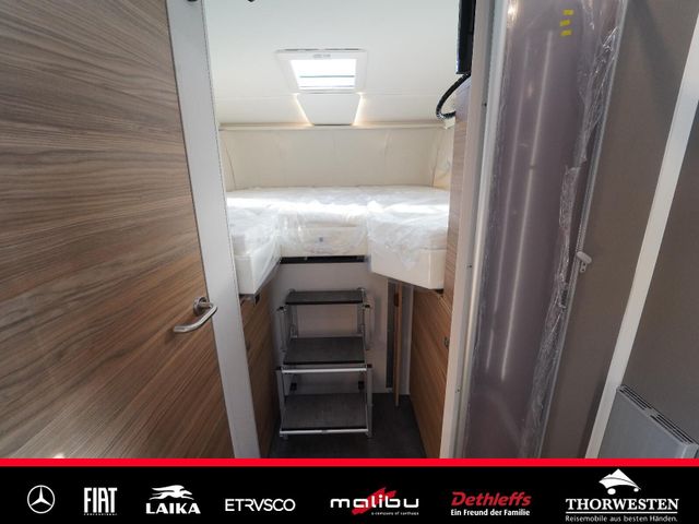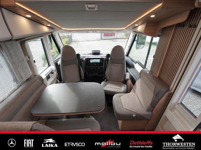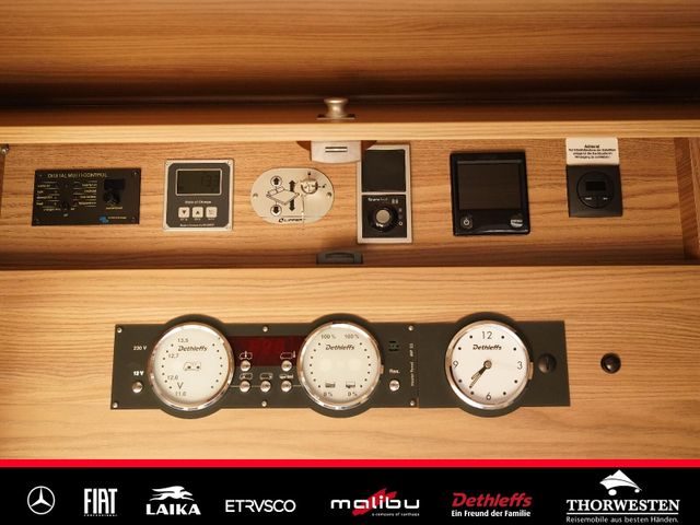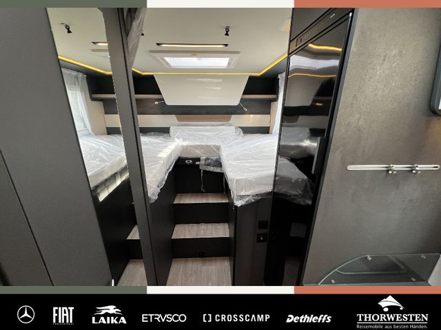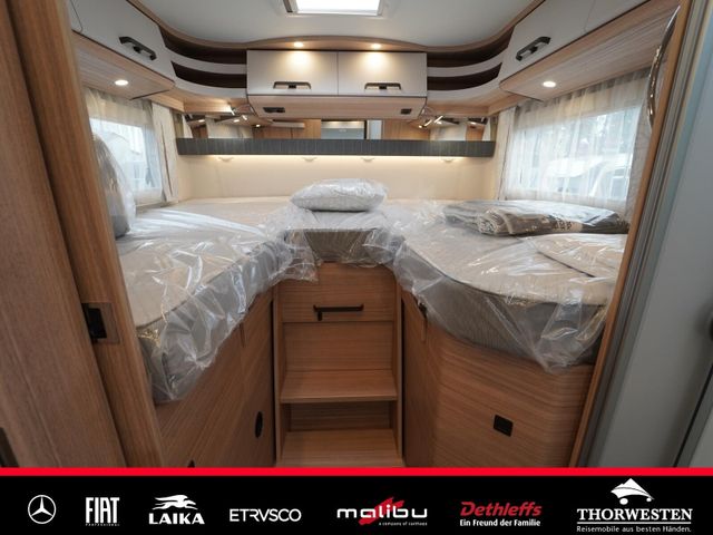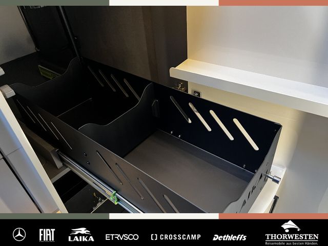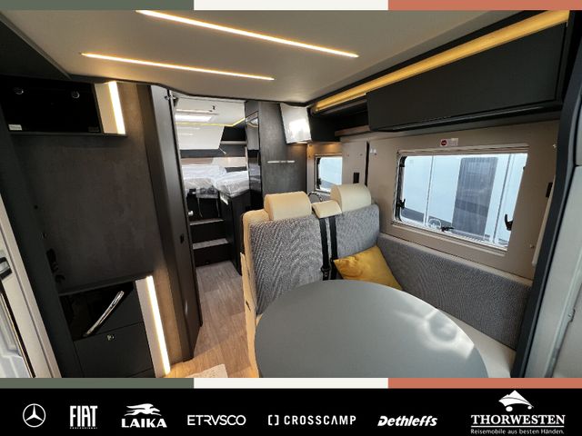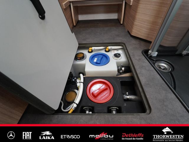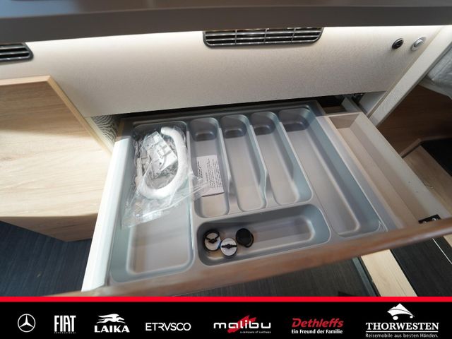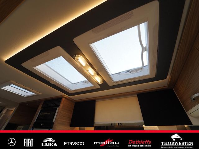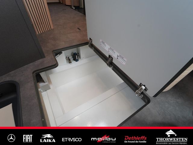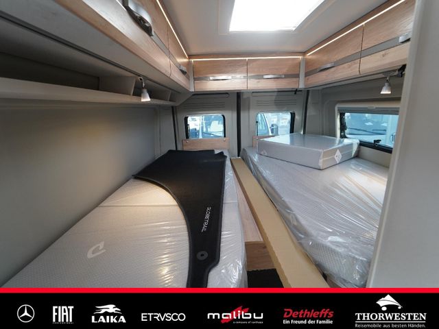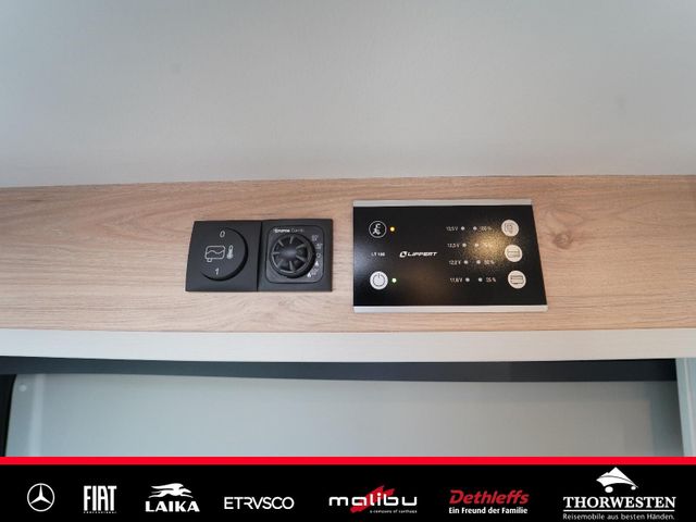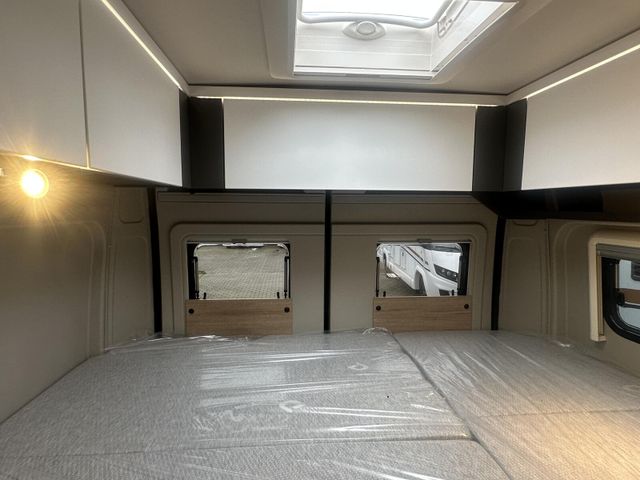 Dachinnenverkleidung mit Mikrofaser-Klimabelag, Upgrade Küchencenter, Qualitäts-Kaltschaummatratze im Heckbett, Truma CP Plus digitales Bedienpanel, Verzurrsystem Gepäckraum, Abwassertank in Gehäuse eingefasst und isoliert)