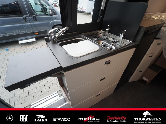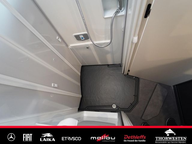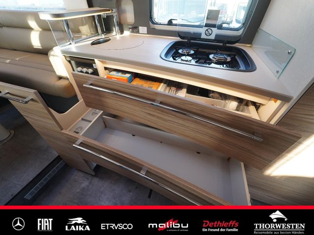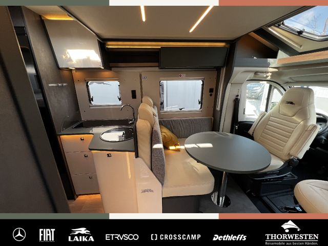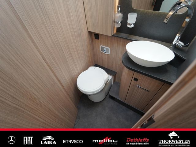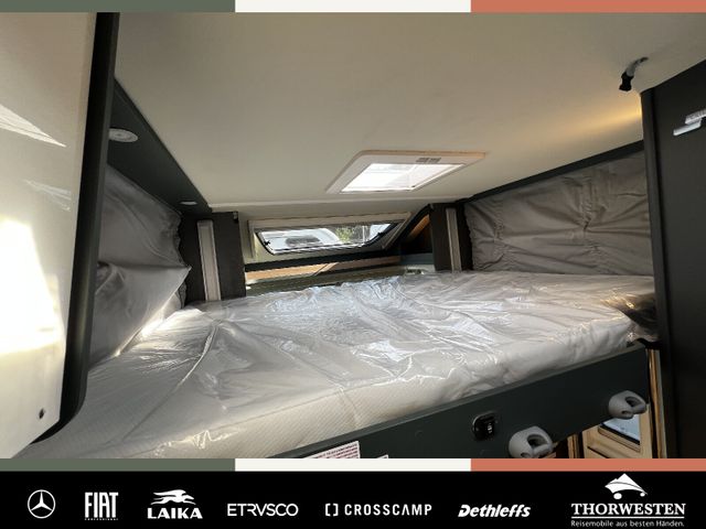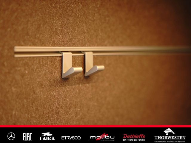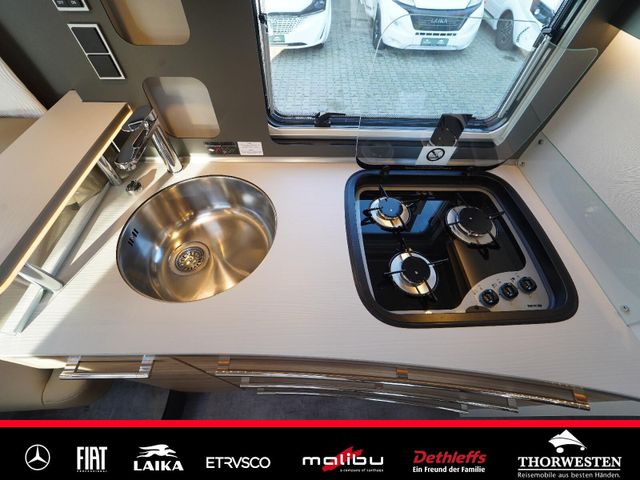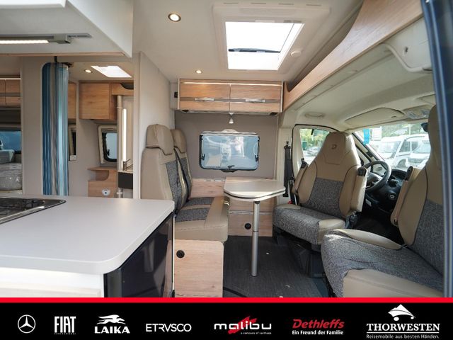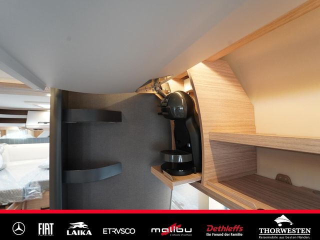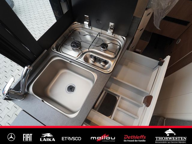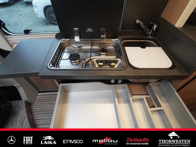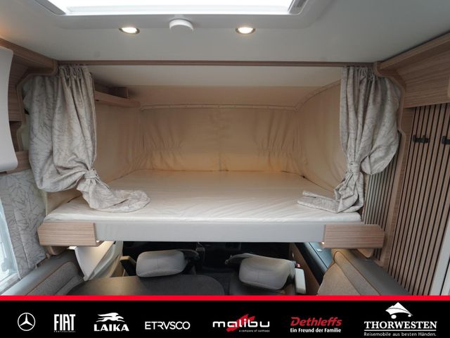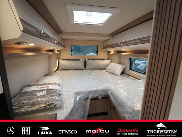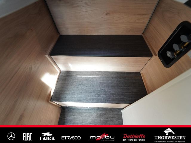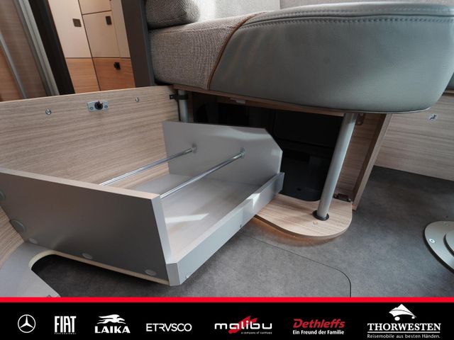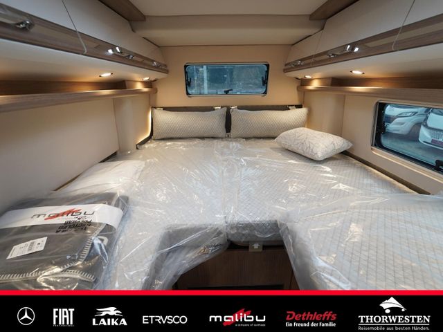 Dachinnenverkleidung mit Mikrofaser-Klimabelag, Upgrade Küchencenter, Qualitäts-Kaltschaummatratze im Heckbett, Truma CP Plus digitales Bedienpanel, Verzurrsystem Gepäckraum, Abwassertank in Gehäuse eingefasst und isoliert)