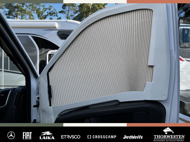 Einparkhilfe mit Sensoren im Heck, Kraftstofftank 90 Liter, Ladebooster, Fahrerhausverdunklungssystem an Front- und Seitenscheiben, Radiovorbereitung mit Dachantenne und DAB+, Lautsprecher (4x), Beifahrersitz höhenverstellbar, Pilotensitze in Wohnraumstoff bezogen inkl. gepolsterten Armlehnen, Fliegenschutzgitter hinter Schiebetür, Außenspiegel elektrisch verstell- und beheizbar, Elektrisch anklappbare Außenspiegel, Scheinwerferrahmen in schwarz, Multifunktionslenkrad (Radiofernbedienung über Steuertasten))